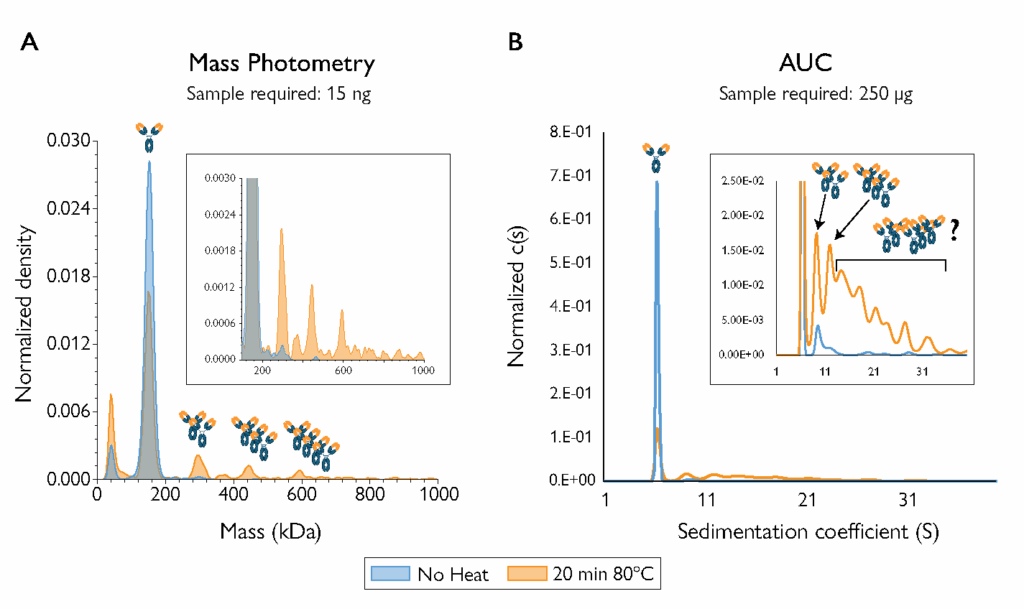 Figure 4. Mass photometry resolved more aggregate species than AUC in heat-stressed samples of the NISTmAb standard, and used 10,000x less sample. The AUC measurement used 250 µg; mass photometry used 15 ng.
