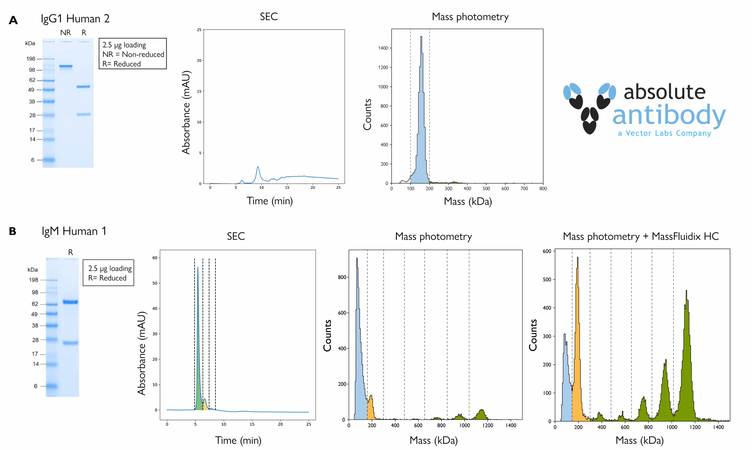 Figure 3. A) Mass photometry, but not SEC, returned clear aggregation readouts for an IgG antibody. Data is shown for analysis of antibody IgG1 Human 2 by SDS-PAGE run under non-reducing (NR) and reducing (R) conditions (left), SEC-UV (middle) and mass photometry (right). The SEC profile suggests that much of the sample was retained within the column. B) IgM pentamers and hexamers were only resolved by mass photometry. Data is shown for analysis of antibody IgM Human 1 by SDS-PAGE run under reducing (R) conditions (far left), SEC (mid left), standard mass photometry (mid right) and mass photometry with MassFluidix HC (far right). The colored peak regions correspond to monomers (blue), dimers (light orange) and higher-order species (green).
