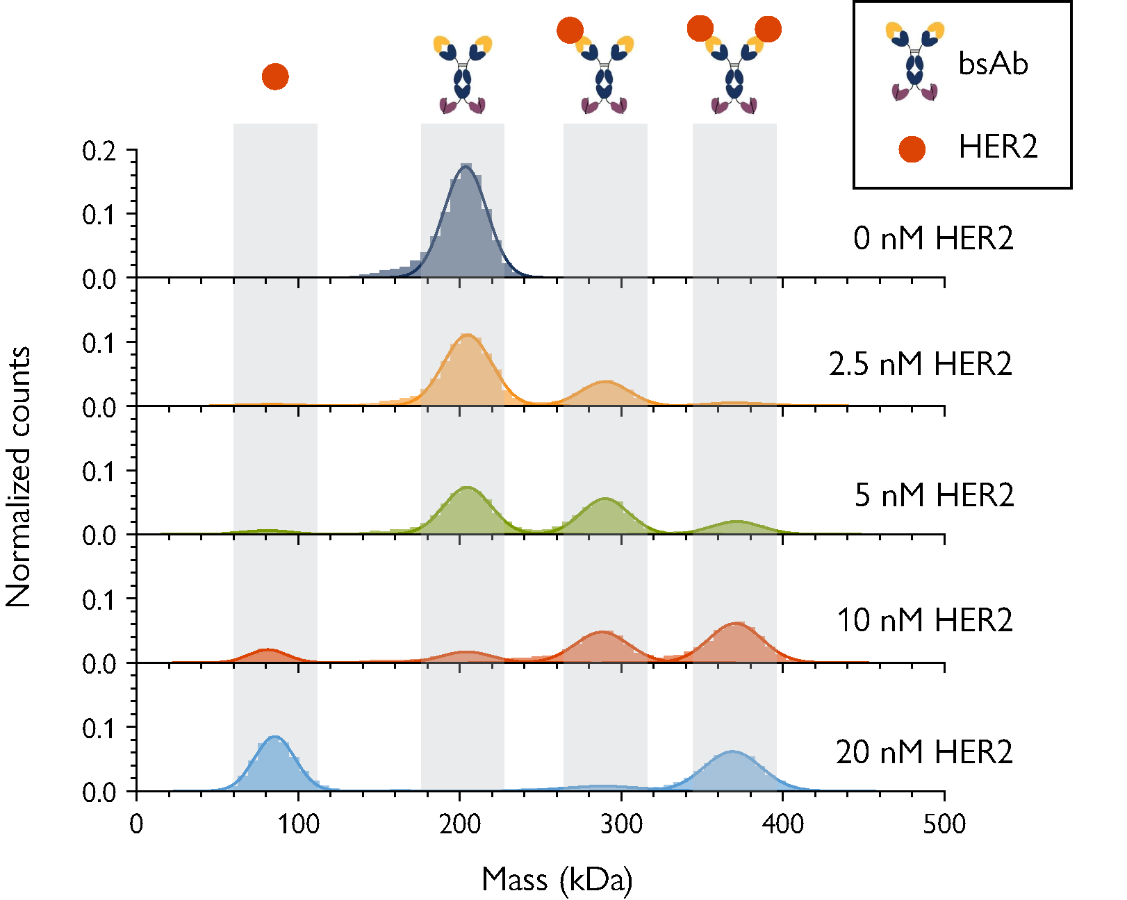 Figure 2. MP resolves complex bsAb-antigen interactions. The concentration of the antigen (HER2) was varied as indicated, with bsAb concentration fixed at 5 nM. As [HER2] increases, the peaks corresponding to free antigen as well as 2:1 Her2-bsAb complex become more prominent.