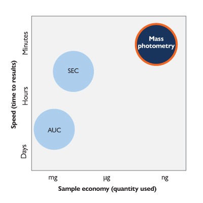 At later stages in Development, MP is a column-free orthogonal to SEC for aggregation assessment when comparing different candidates or conditions e.g. in forced degradation / accelerated stability studies. MP is 300x faster and uses at least 8000x less sample than AUC – the current technique used as a column-free orthogonal to SEC.
