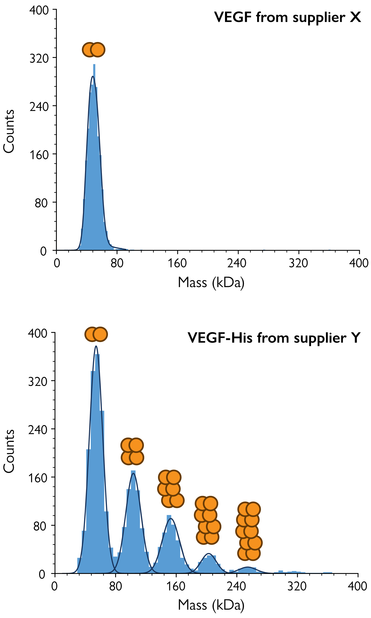 Figure 5. MP reveals differences in VEGF oligomerization between suppliers. MP was used to measure samples of the antigen VEGF from supplier X (top) and VEGF-His tag from supplier Y (bottom). MP clearly showed significant oligomerization in the supplier Y sample, although VEGF naturally exists as a dimer. Both samples were tested in PBS buffer at nanomolar concentrations.