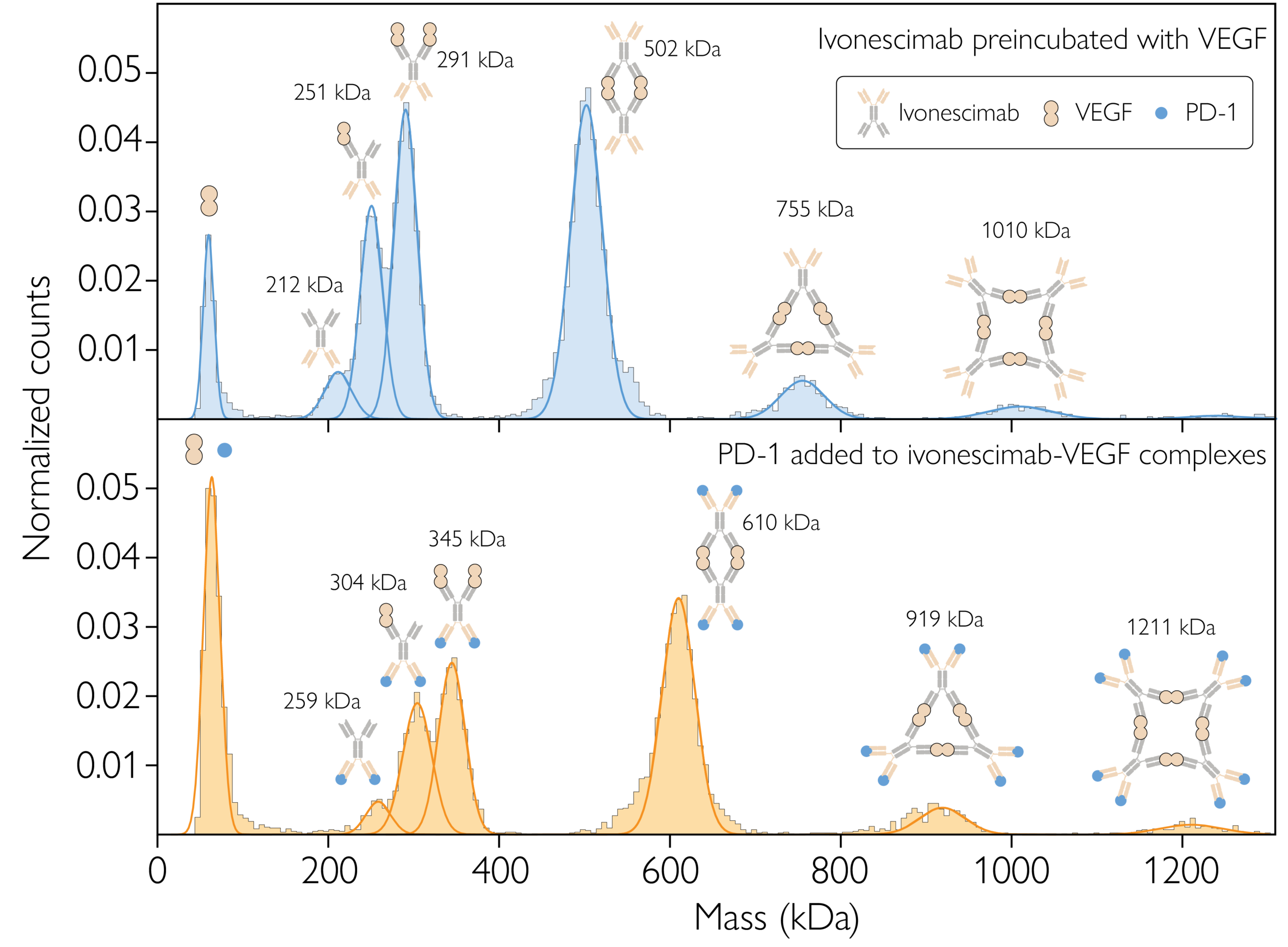 Figure 3. MP resolves the complexes formed from bispecific antibody ivonescimab interacting with its targets, VEGF and PD-1. Top: Ivonescimab–VEGF complex formation at equilibrium, with a 1:2 concentration ratio. Bottom: Ivonescimab–VEGF–PD-1 complex formation at equilibrium, with a 1:2:2 mixing ratio. Each plot shows the counts (normalized) of particles detected within each mass bin vs. the molecular mass. The schematics above each peak represent putative complex structures. Source: https://www.biorxiv.org/content/10.1101/2025.09.05.674400v2.full