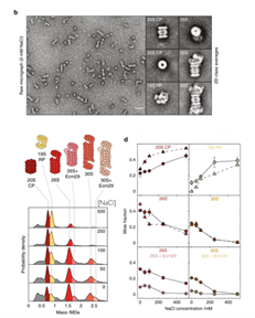 Figure 3. Mass photometry enables rapid screening of buffer conditions for proteasome stability and agrees with nsEM. Mass photometry (MP) histograms show the 30S proteasome dissociating into smaller subunits at increasing NaCl concentrations, with the relative abundance of each species consistent between the two techniques. (Adapted from Sonn-Segev et al., Nature Communications, 2020)