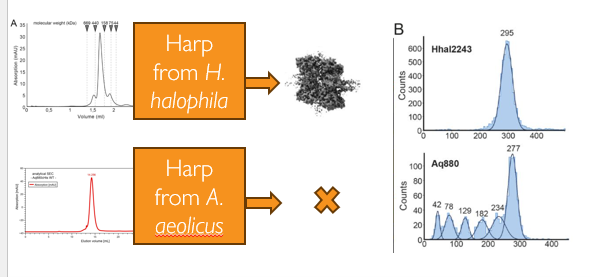 Figure 2. Mass photometry reveals hidden polydispersity missed by SEC. Despite similar SEC profiles, mass photometry (MP) showed that for one HARP oligomer (Aq880), the main species, made up only half the sample, with multiple LMWS also present. (Adapted from Feyh et al., eLife, 2021)