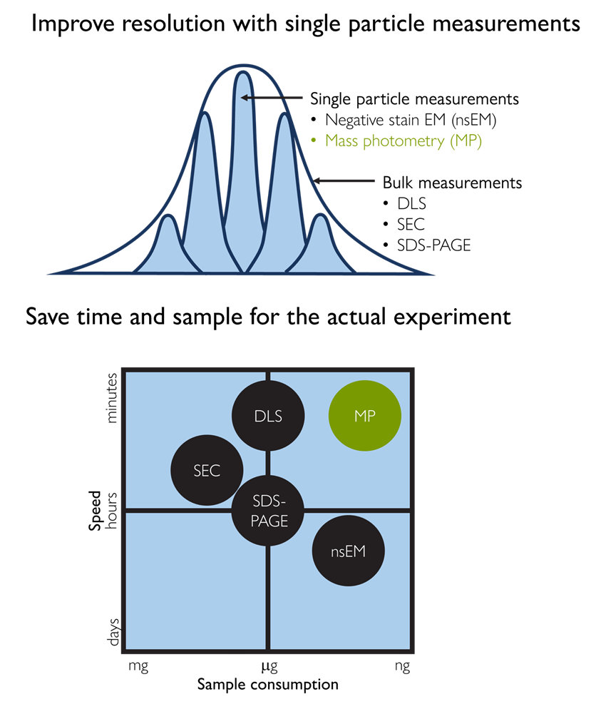 Figure 1. Mass photometry combines speed, resolution, and low sample consumption. Conventional ensemble techniques, such as SEC, DLS, and SDS-PAGE, are fast but lack single-molecule resolution. Negative stain EM (nsEM) offers that resolution but is slow and resource-intensive. Mass photometry occupies a unique position, delivering single-molecule resolution with rapid turnaround and minimal sample consumption.