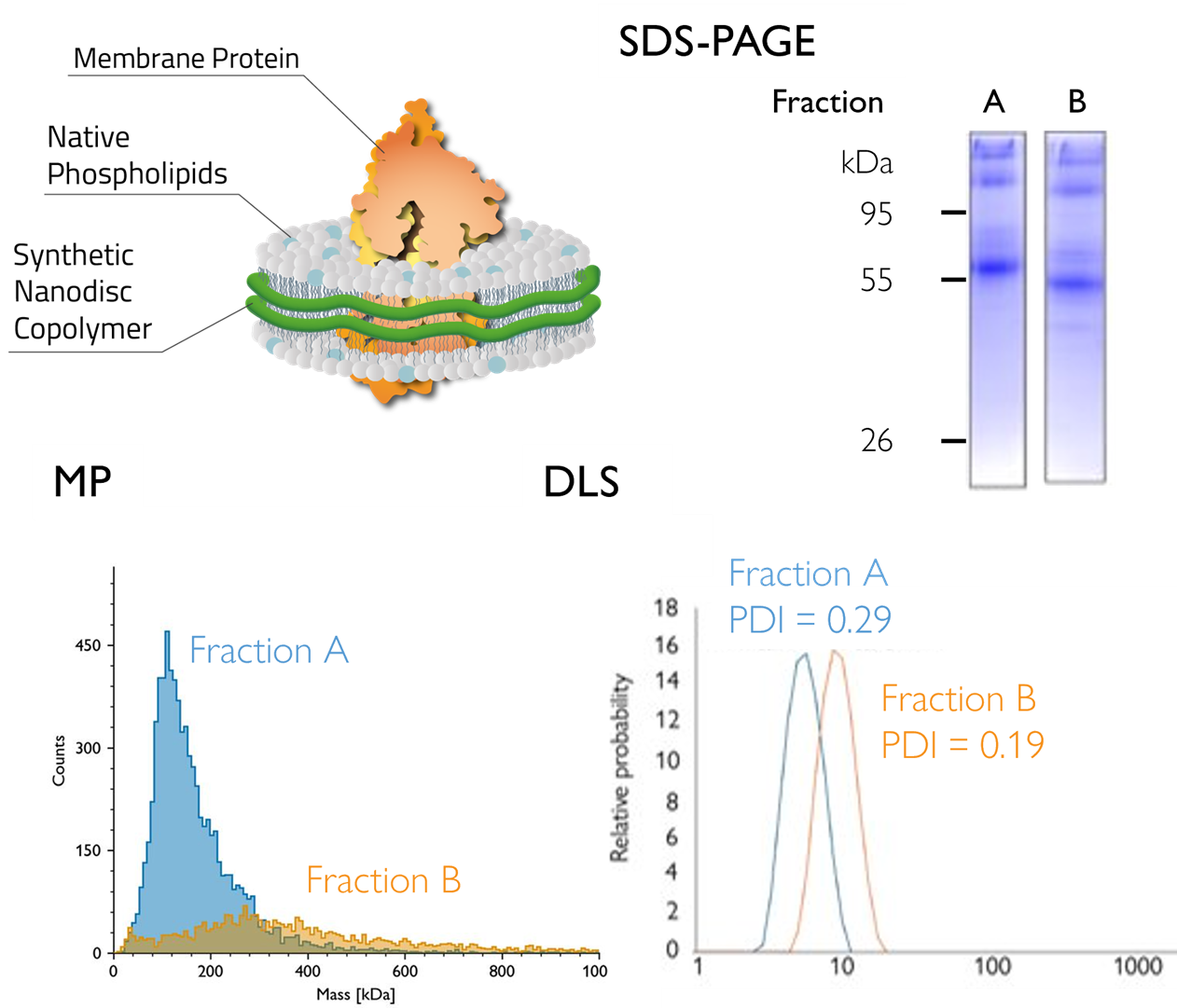 Figure 4: Mass photometry identifies the optimal SEC fraction of a nanodisc-embedded GPCR. MP analysis showed one fraction of GPCR GLP1 (solubilized in nanodiscs) was more homogeneous, with a mass consistent with the expected value (~110 kDa) – information not resolvable by dynamic light scattering (DLS) alone. Data obtained in partnership with Cube Biotech. (Adapted from Mass photometry analysis of GPCRs in copolymer nanodiscs)