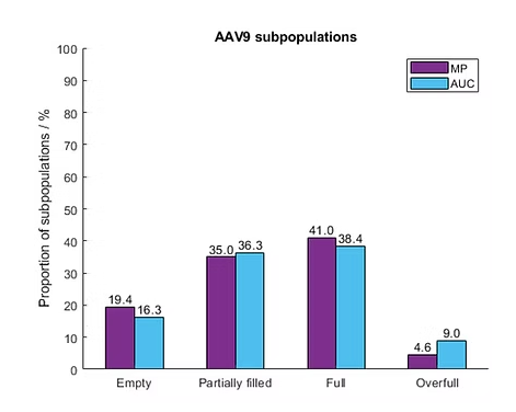 Figure: Mass photometry (MP) results for AAV empty/full analysis are comparable to those obtained using AUC, a commonly used technology for AAV characterization. Source: Wagner et al., Int. J. Mol Sci, 2023.