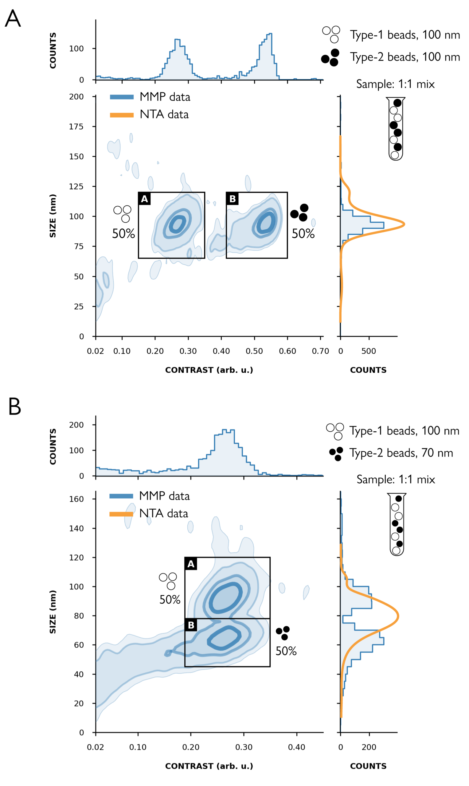 Figure 2. MMP clearly resolves populations that cannot be resolved using NTA – as illustrated with 1:1 mixtures of beads. A) Both sets of beads are 100 nm in diameter but they have different contrasts (mass proxy): B) The beads have different sizes (70 nm, 100 nm) but similar contrast. Measured on the Karitro™* macro mass photometer.