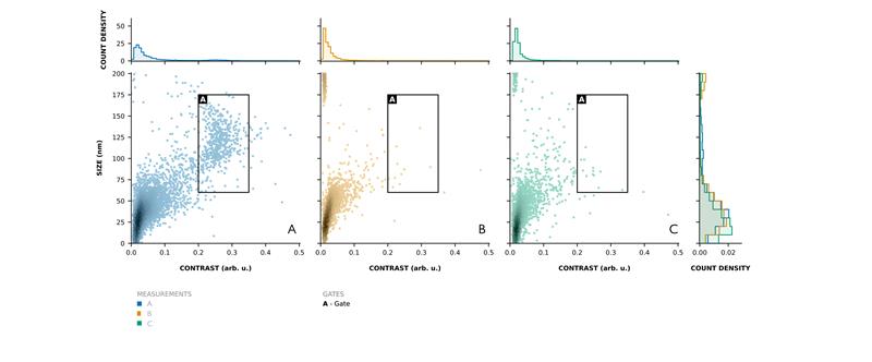 Figure 3. MMP distinguishes LVV particles from impurities without any labelling or sample pretreatment. MMP analysis of LVV (A), negative control (B) and non-infectious (C) particles shows MMP can distinguish impurities from larger, heavier LVV particles based on their lower contrast (mass proxy) and smaller size. Measured on the KaritroMP.