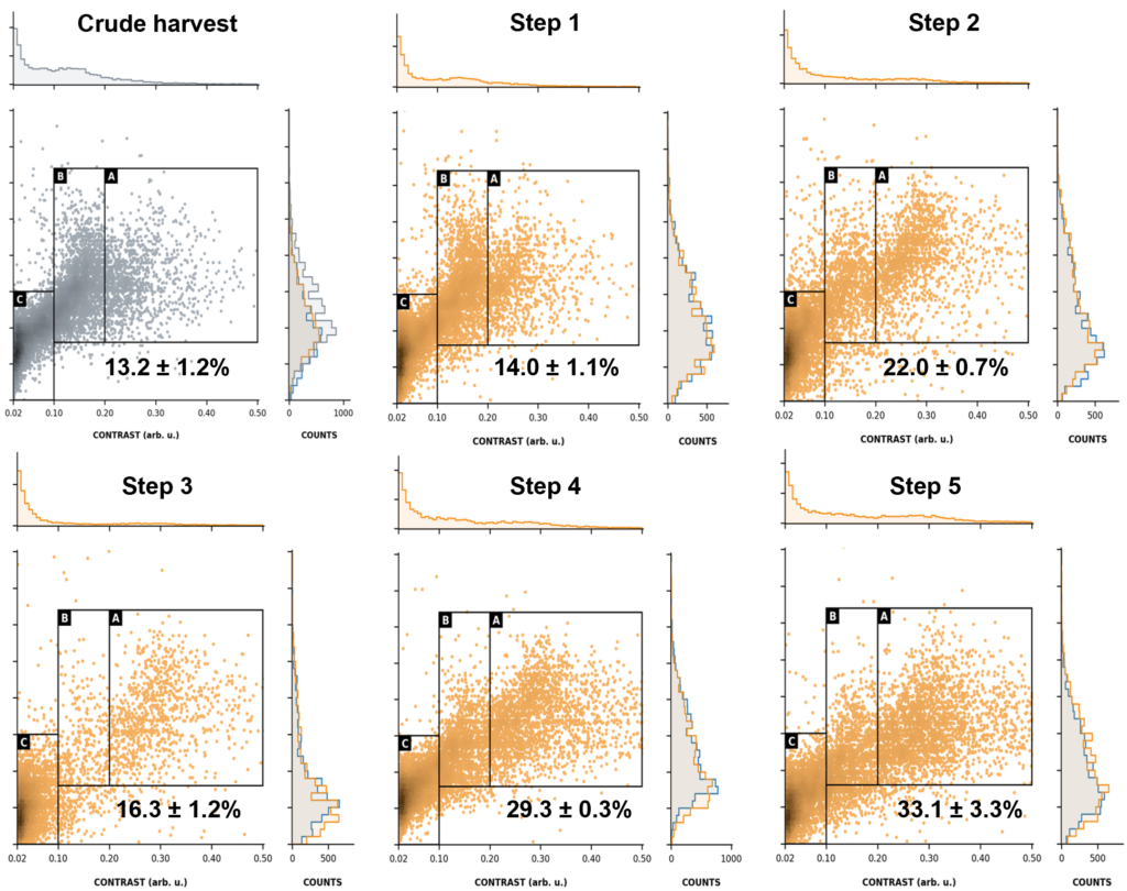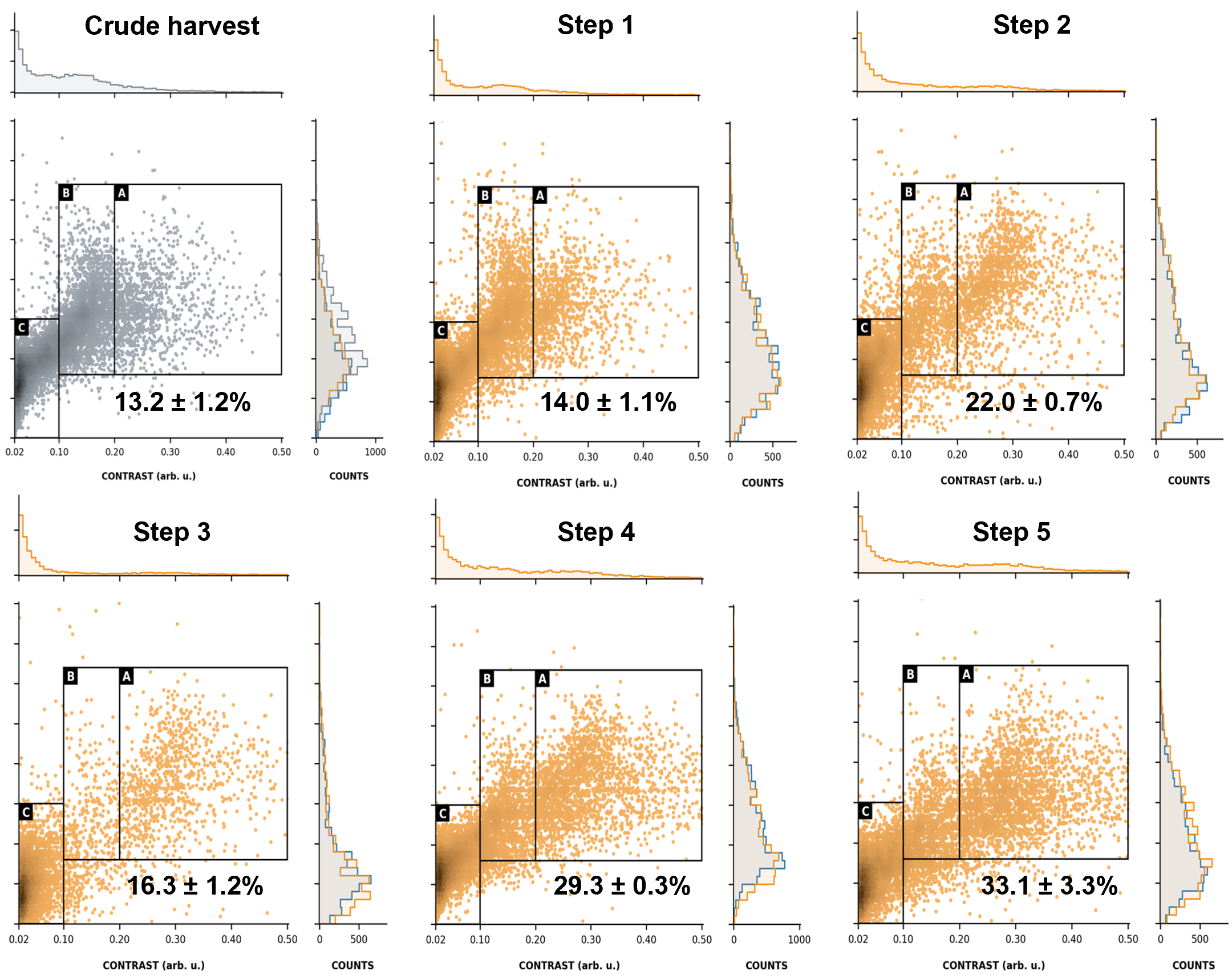 Figure 4. MMP provides clear insights into sample composition throughout processing. LVV samples collected in upstream production and after five sequential purification steps were analyzed by MMP using gated regions that resolve: LVVs (Gate A), EVs (B), and cell debris or smaller vesicles including degraded EVs and LVVs (C).
