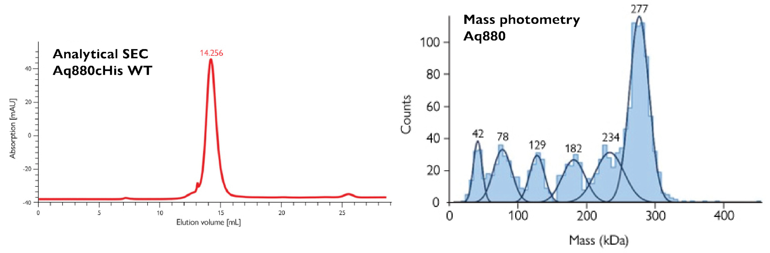 Figure 4. Mass photometry (MP) reveals polydispersity. MP analysis of A. aeolicus RNase P (Aq880) revealed a major species at 277 kDa, along with several lower-mass species – a crucial insight for Feyh et al., eLife 2021. The authors reported: “Polydispersity of Aq880, not detectable in SEC profiles, is probably the reason why all structural approaches failed so far.