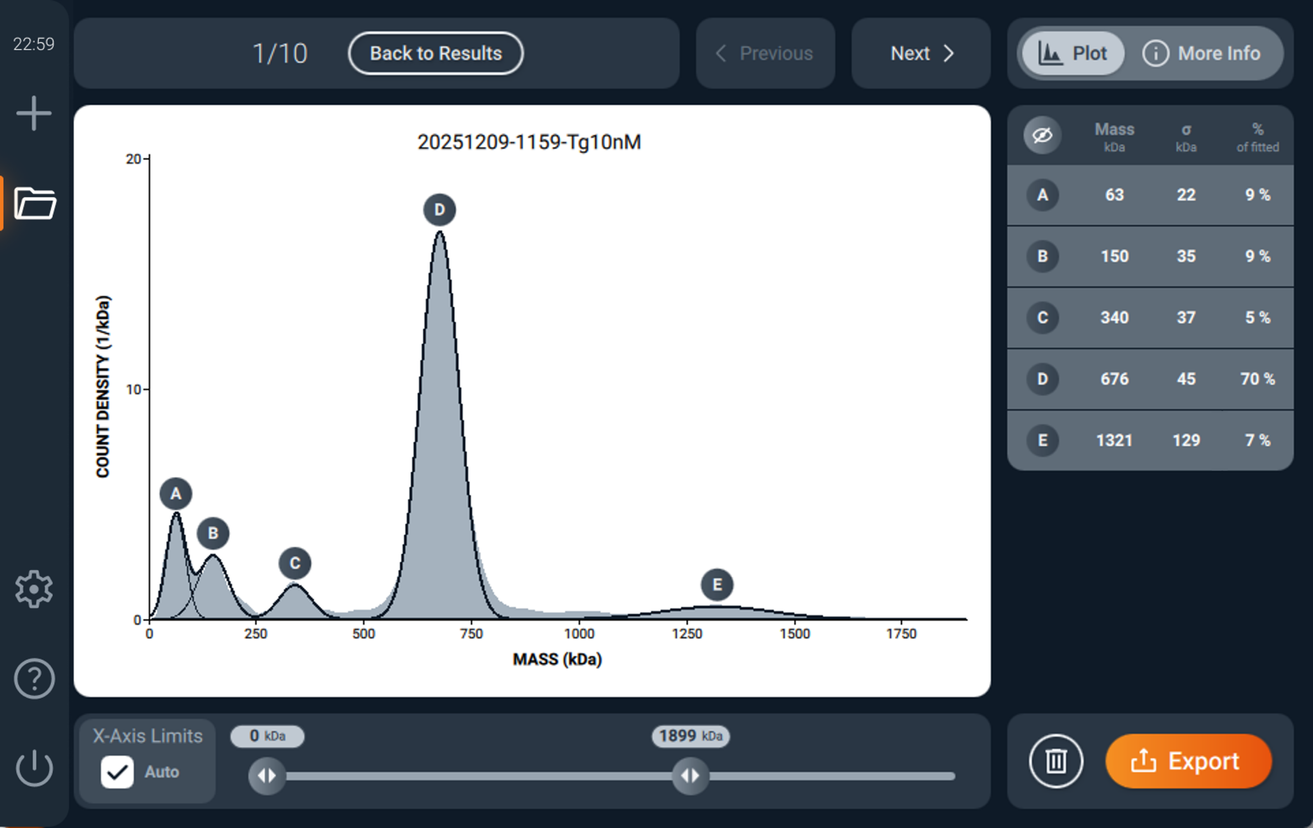 Simple, powerful analysis: Mass distribution, automatic peak fitting, and a clear results table give you everything you need to assess your sample