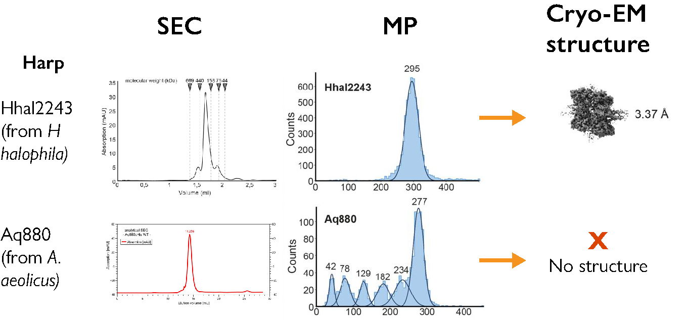Figure 2. Mass photometry reveals hidden polydispersity missed by SEC. Despite similar SEC profiles, mass photometry (MP) showed that for one HARP oligomer (Aq880), the main species, made up only half the sample, with multiple LMWS also present. (Adapted from Feyh et al., eLife, 2021). The authors observed: “This polydispersity of Aq880, not detectable in SEC profiles, is probably the reason why all structural approaches failed so far in the case of Aq880.”